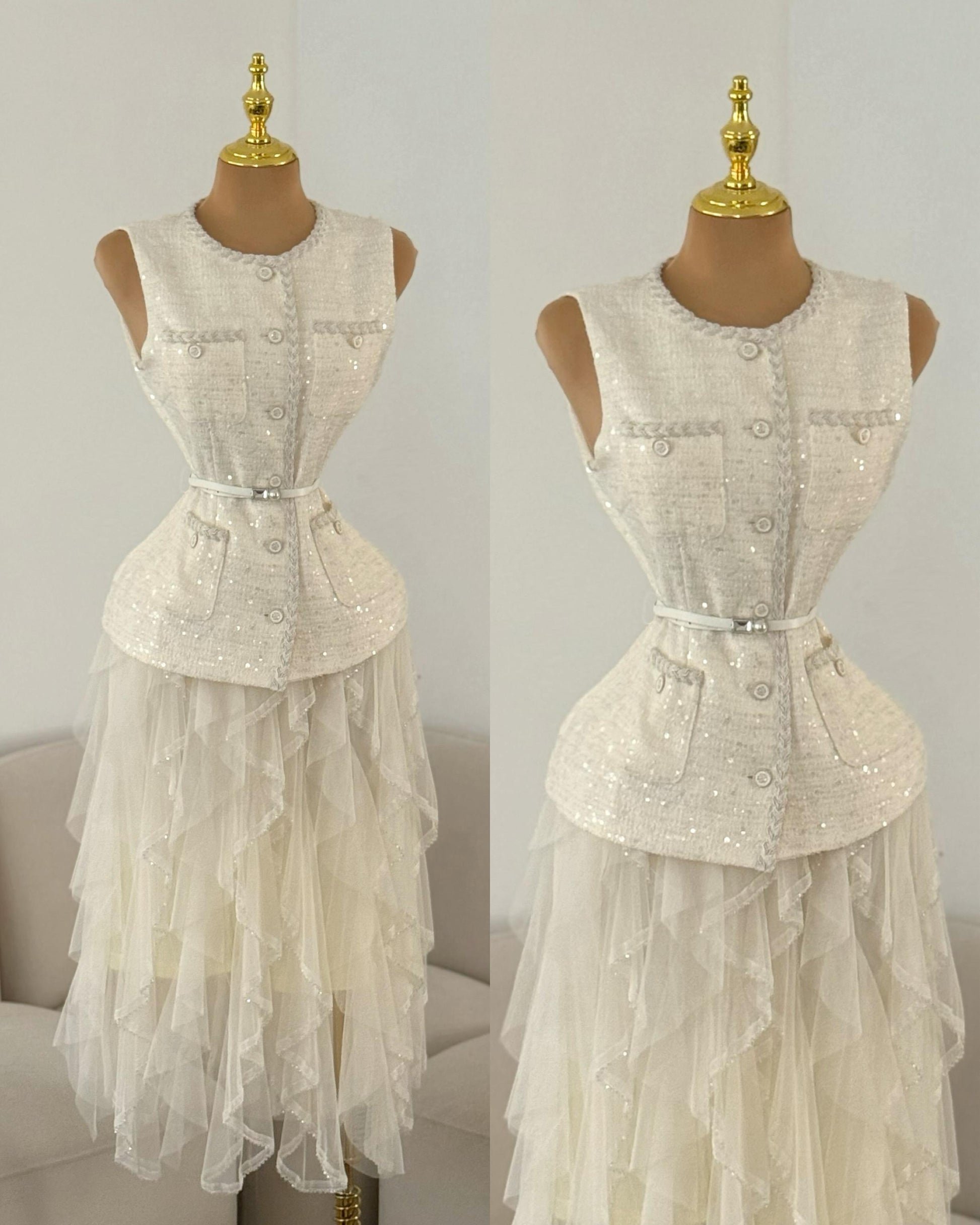 Diseño: Hermoso look, un chaleco en tela de tweed súper fino, acomoda increíble, incluye el cinto y trae detalles preciosos