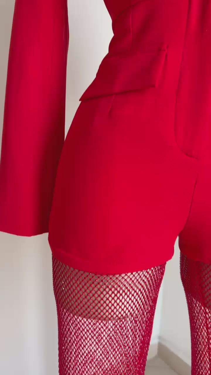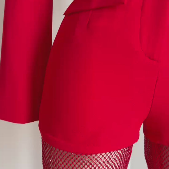 Material: Tejido estructurado para el blazer y shorts, combinado con una malla semitransparente en la parte inferior.