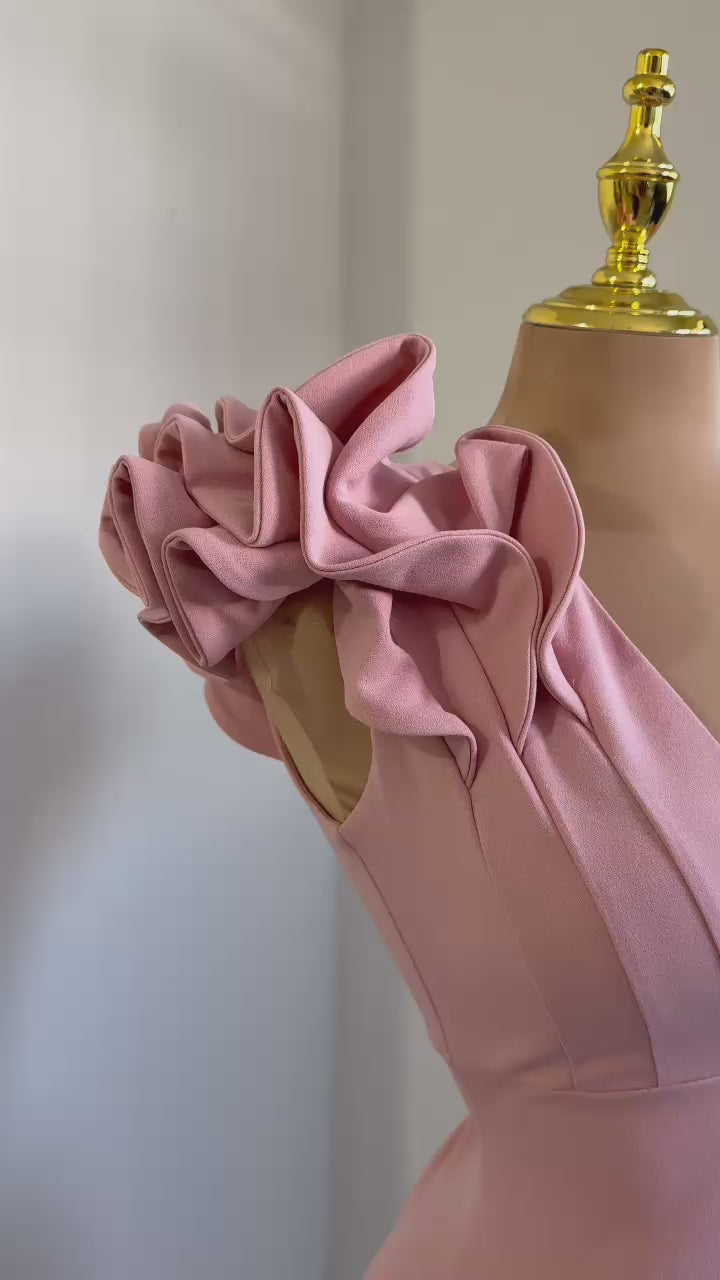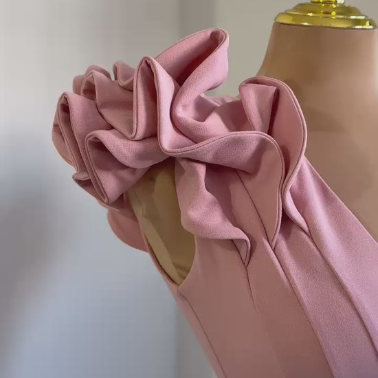 Vestido color palo de rosa en tela strech, con escarolas en los hombros, acomoda genial al cuerpo